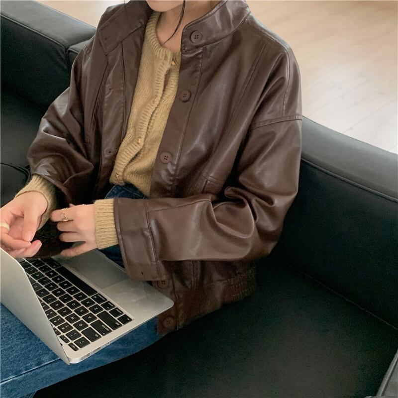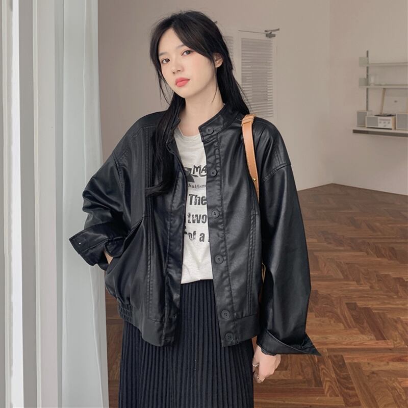 オータムルーズブラックレザーポケットスタンドカラーカラー長袖スリーブジャケット ロング 秋物 misskkl56832638567