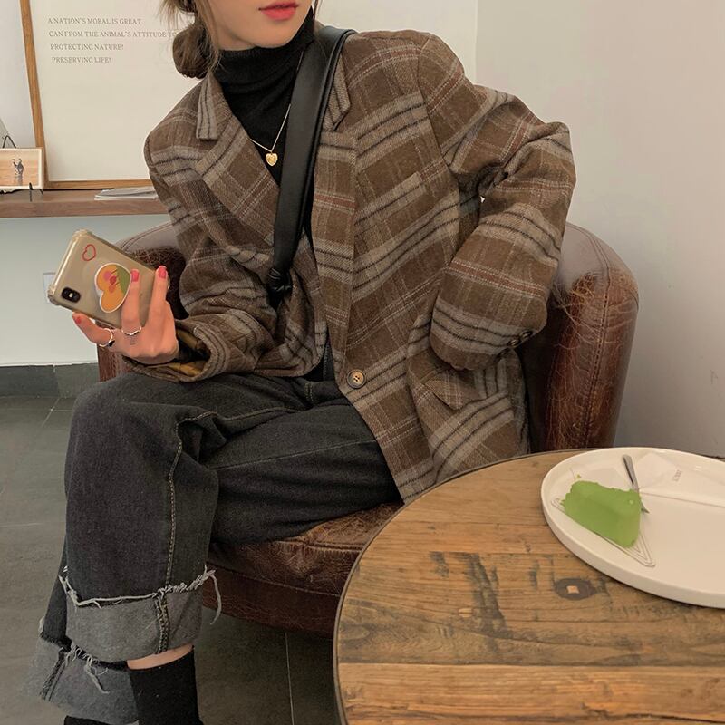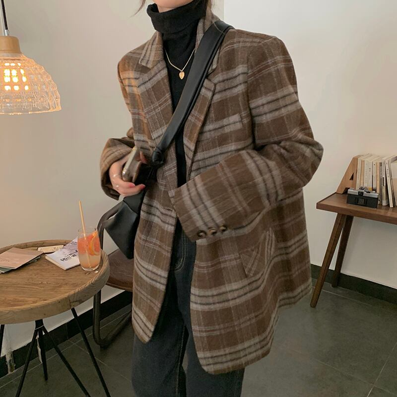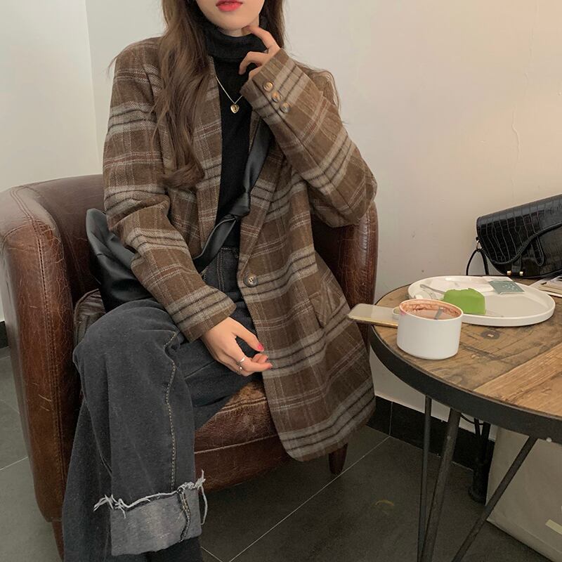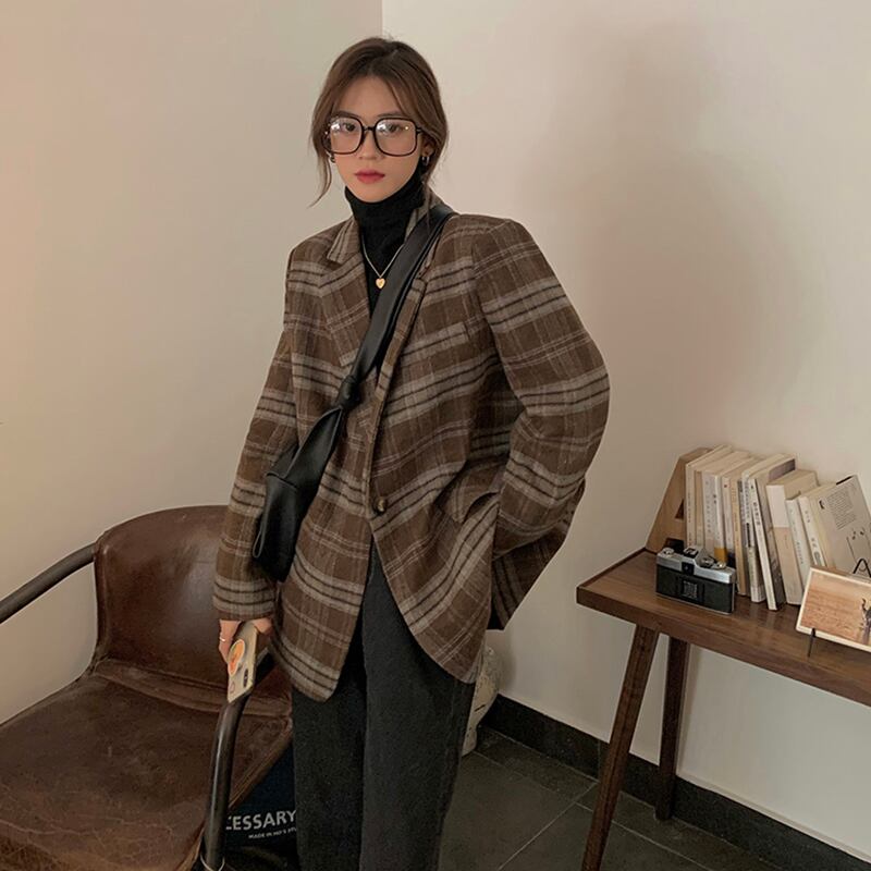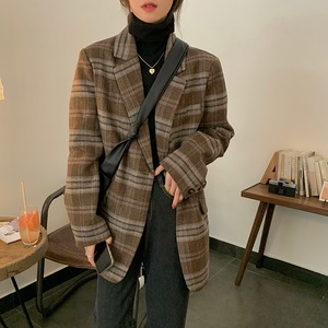 オータムスタンダードルーズカラーブラウン格子柄ジャケット ロング レトロ 秋物 misskkl68673369502